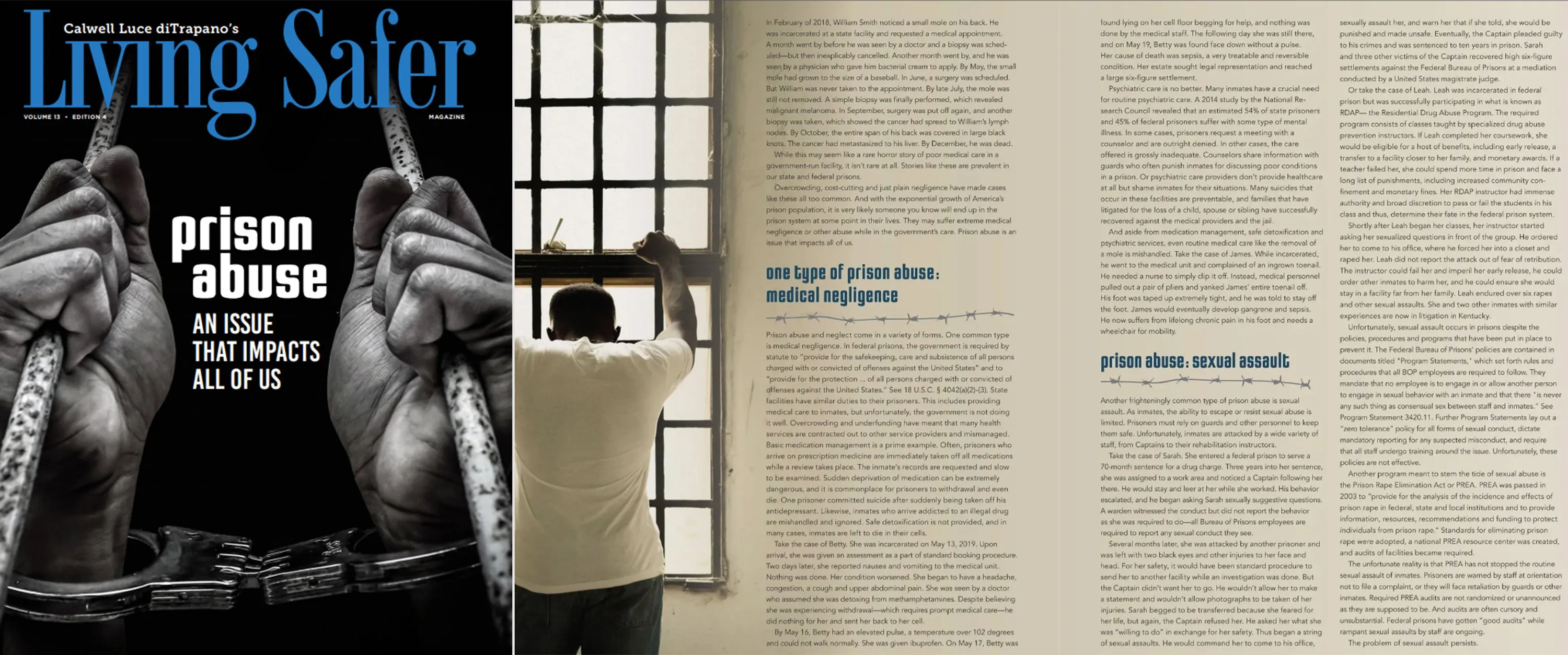 Calwell Luce diTrapano PLLC is proud to share Living Safer Magazine with our website visitors. In addition to the feature article about "Prison Abuse," written by L. Dante' diTrapano & Emily Calwell France, there are dozens of other articles in the magazine on topics ranging from easy healthy habits and determining if you need disability insurance to the FDA approval process and tips for weathering a power outage. Click here for access to the full magazine.